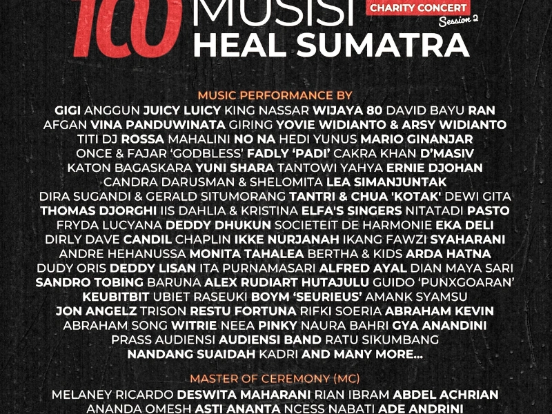 Aksi kemanusiaan berskala nasional kembali hadir melalui konser amal bertajuk 100 Musisi Heal Sumatra. Kegiatan ini mempertemukan puluhan musisi lintas generasi untuk menggalang donasi bagi korban bencana alam di berbagai wilayah Sumatra.