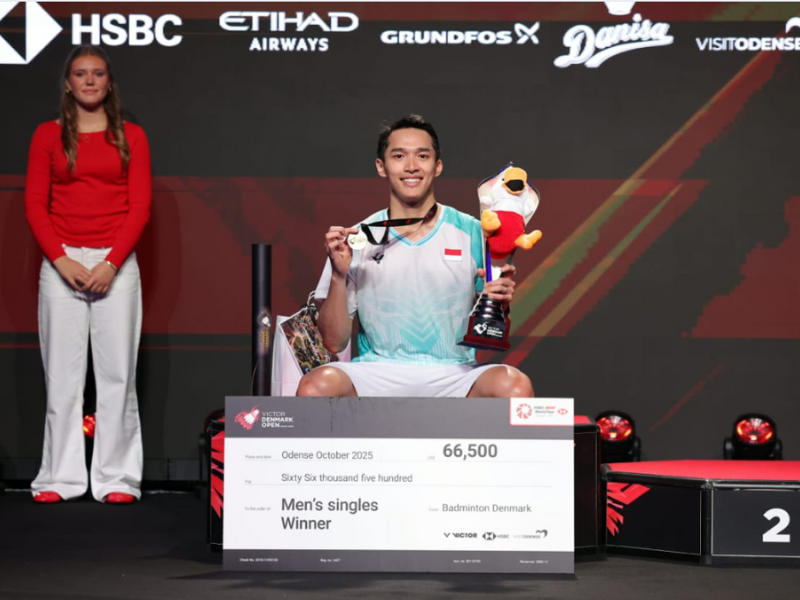 Jonatan Christie menutup turnamen Denmark Open 2025 dengan gemilang setelah mengalahkan unggulan asal Tiongkok, Shi Yu Qi, di final tunggal putra. Pertandingan yang digelar di Jyske Bank Arena, Odense, Minggu (19/10/2025), berakhir dengan skor 13–21, 21–15, 21–15 untuk kemenangan Jonatan (BadmintonPlanet, 2025).