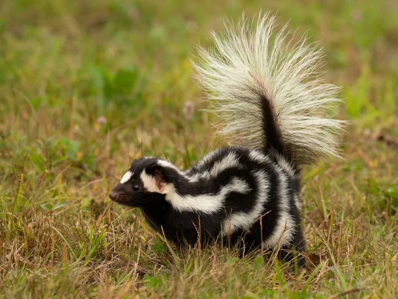 - Striped Skunk (Mephitis mephitis) – spesies paling umum di Amerika Utara dengan garis putih tegas di punggung.