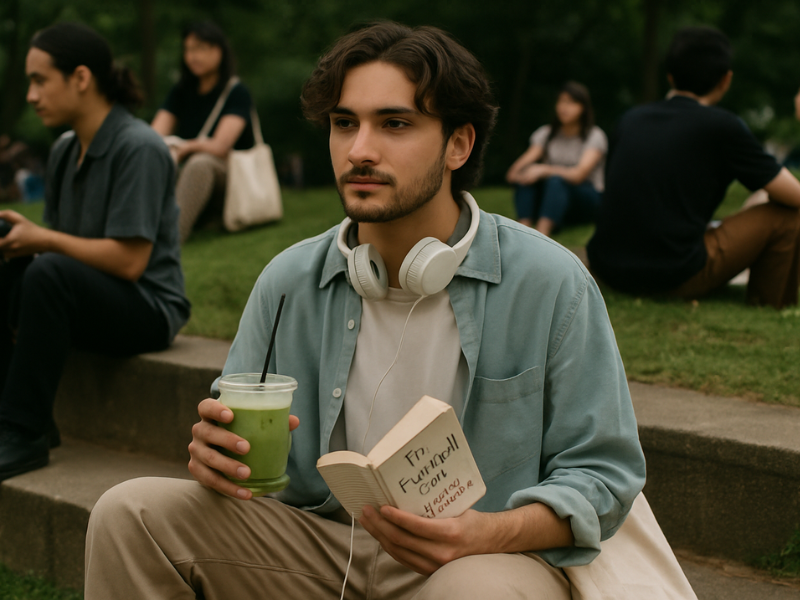 Sosok performative male biasanya punya “starter pack” yang khas: matcha latte di tangan kiri, buku The Second Sex di tangan kanan, totebag putih berisi kamera analog, dan style semi-vintage dengan rambut agak acak. Playlist-nya? Pasti ada Clairo, Laufey, atau Radiohead.