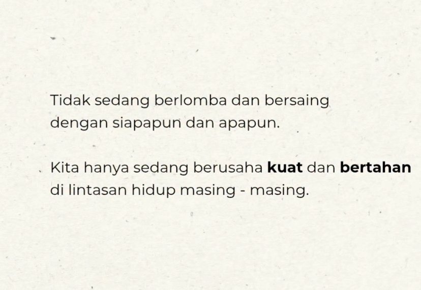 Hidup bukan perlombaan. Tidak ada garis finish yang harus dicapai dalam waktu yang sama. Ada orang yang terlihat cepat, tapi masih mencari arah. Ada juga yang terlihat lambat, tapi justru lebih siap ketika sampai. Yang penting bukan seberapa cepat kamu berjalan, tapi seberapa sadar kamu dengan prosesmu. Kamu tidak tertinggal. Kamu hanya sedang berjalan dengan ritmemu sendiri.