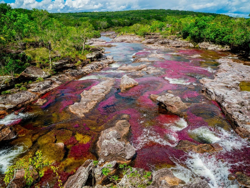 Selain warna merah dominan, nuansa kuning dan hijau berasal dari pasir dan lumut yang menempel di bebatuan, sementara pantulan cahaya menghasilkan warna biru dan hitam alami. Semua unsur ini berpadu menciptakan lanskap yang tampak seperti pelangi cair di tengah hutan tropis Kolombia.