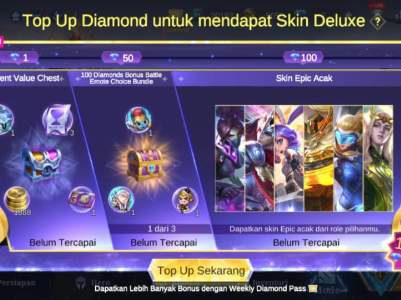 Hanya dengan melakukan recharge diamond berapapun, kalian bisa langsung memilih 1 hero permanen dan 1 skin spesial permanen. Kesempatan ini tentu sangat sayang untuk dilewatkan, apalagi bagi pemain yang ingin mempercantik koleksi skin tanpa harus keluar biaya besar.
