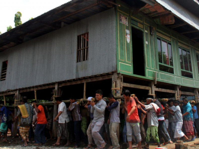 Pemindahan dilakukan secara serentak oleh puluhan hingga ratusan warga laki-laki. Mereka mengangkat rumah dengan menggunakan bambu sebagai penopang dan berjalan perlahan menuju lokasi baru. Jika jarak cukup jauh, rumah bisa digeser menggunakan roda atau batang kayu. Kaum perempuan menyiapkan makanan dan minuman bagi peserta pemindahan sebagai bentuk dukungan dan rasa syukur. (Indonesia.go.id, 2019)