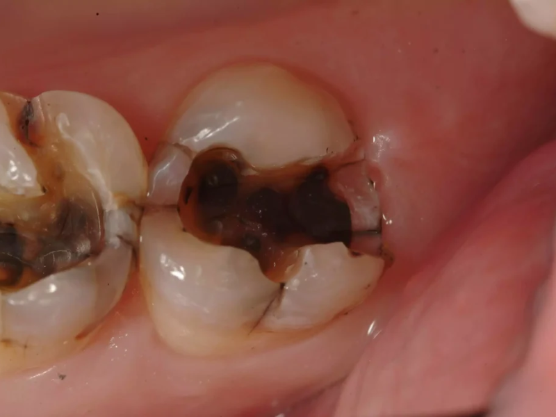 - Lubang pada gigi: Terlihat sebagai titik hitam atau cokelat pada permukaan gigi.