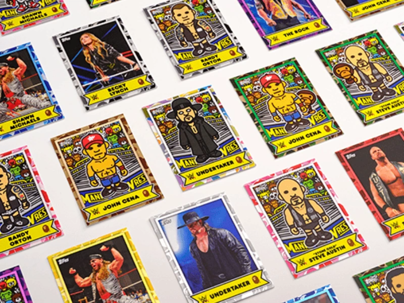 Kolaborasi resmi antara WWE dan brand streetwear Jepang BAPE meluncurkan seri kartu trading edisi terbatas bersama Topps. Koleksi premium ini menggabungkan ikon-ikon WWE dengan estetika khas BAPE, menciptakan produk yang langsung diburu komunitas kolektor global (Topps, 2025).